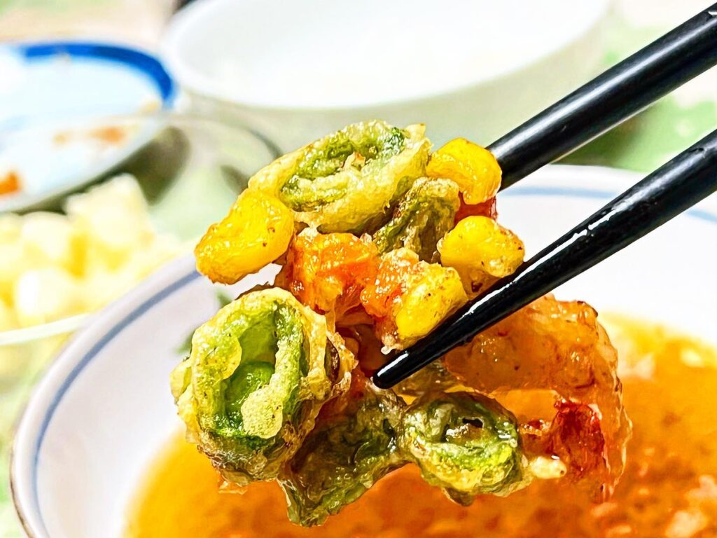 かき揚げを麺つゆで頂く。あっさり系で美味しいよ˙꒳˙)˙꒳˙)ゞせいろ #かき揚げおろし蕎麦 #かき揚げ大好き