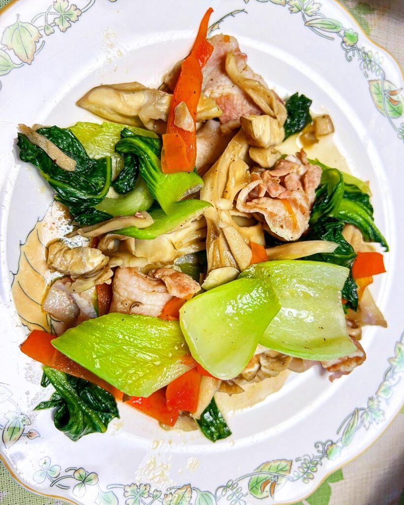豚野菜炒め えりんぎ、八宝菜 にんじん今日も美味しくいただきます。॑⸜(* ॑꒳ ॑* )⸝⋆*